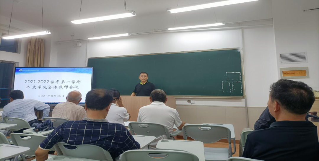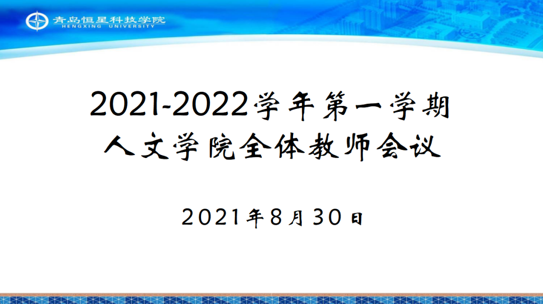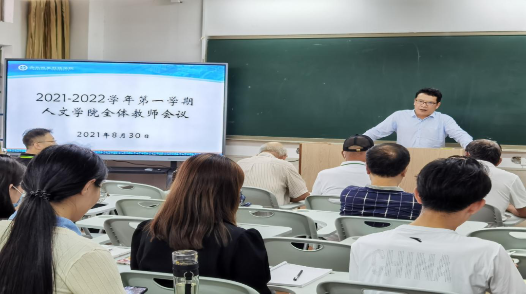 人文学院全体教师会议 为全面贯彻落实高校立德树人精神,秉持“文化育人、管理育人、教育育人、服务育人”的宗旨,青岛恒星科技学院人文学院于2021年8月30日下午在A2-307教室召开2021-2022学年第一学期全体教师会议 参加本次会议的有人文学院党总支书记孔祥丽、副书记满德全、文教集团总裁兼副院长刘振勇、副院长潘澈、院长助理汤伟、教学助理韩英、汉语言文学专业带头人孟兆臣教授、社会工作专业带头人樊荣教授,各教研室主任及全体新老教师。学院名誉院长马士远教授也参加了此次会议。会议由孔祥丽书记主持。 会议初始,马院长应邀致辞。对学期初人文学院教师队伍的人员调整变动及教研室细分工作给予了充分肯定,调整后的领导班子和管理团队能更好地服务教学、开展各项工作并与全国高校专业建设管理接轨。马院长对新老师表示热烈的欢迎,希望新老师以最短的时间适应学院氛围,促进学院教学事业更好、更快地发展。马院长特别强调,人文学院教师团队老、中、青结合,既要发扬敬老传统,又要帮扶刚参加工作的青年教师快速提升,尽快适应岗位工作,确保教学质量。 会上,副院长潘澈对2019、2020级学生报到返校工作的顺利展开表示肯定,对学院各教研室教学工作进行了周密的部署。重点传达了学校迎评工作会议精神,强调了为做好迎评各项工作,大家都要做好自己的岗位工作,齐心协力,团结合作,为我校本科合格评估打下坚实基础。 最后,文教集团总裁兼副院长刘振勇做总结讲话,希望本学期继续做好各项教学工作,按照学校要求做好产教融合各项工作,号召全体教师要带动学生营造积极向上的学风,让学生在四年的大学学习中打好理论基础,增强实践技能。 壮阔东方潮,奋进新时代。人文学院今年新入学人数在前两年新入学人数递进增长的总数基础上翻了一番。全体教师将继续不忘立德树人初心,牢记人才培养使命,脚踏实地,开拓创新,为绘就学院的美好蓝图不懈努力!