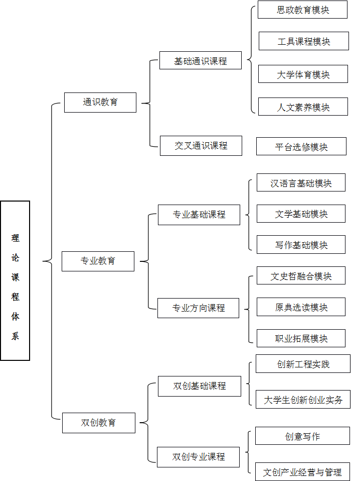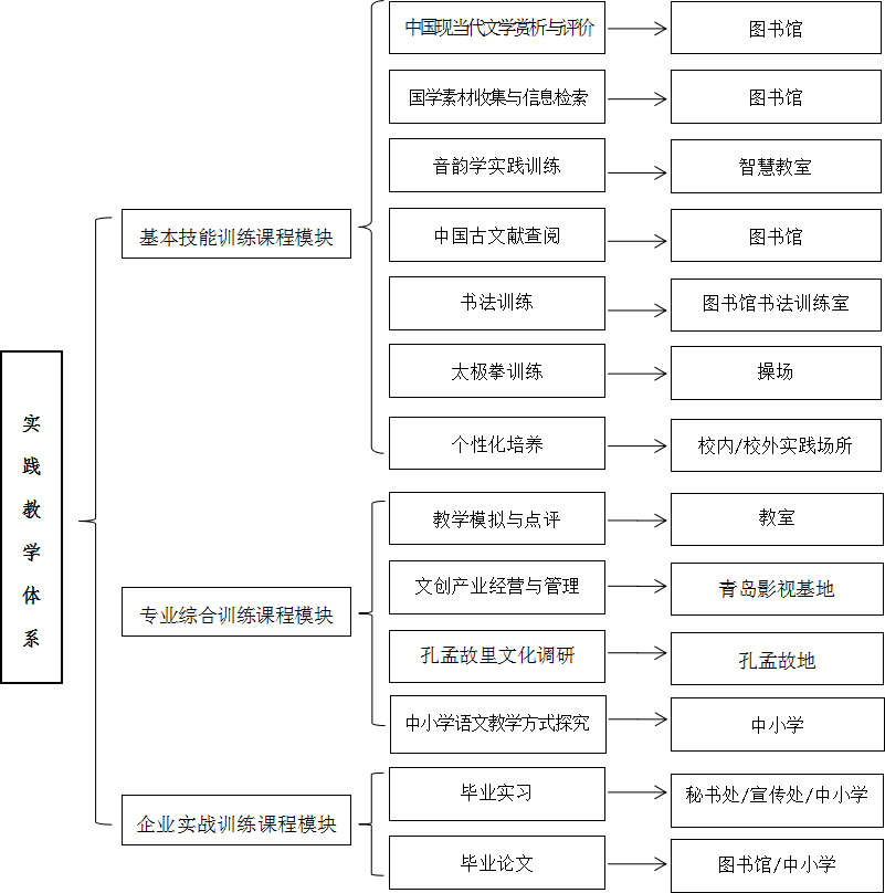 一、培养目标 本专业坚持立德树人,培养德智体美劳全面发展,知识结构合理、动手能力强、综合素质高,系统掌握汉语言文学的基本知识,具有较强审美能力和语言文字表达的能力,具有良好的人文素养和创新精神,能够在党政机关、企事业单位从事语言文字工作,或从事新时代中华优秀传统文化传播和语文教学工作的高素质应用型人才。 二、毕业要求 1.思想观念:具有良好的思想道德品质,坚持正确的政治方向,树立正确的世界观、人生观、价值观。 2.通识知识:掌握政治法律基础知识;把握国内外时事动态;具备英语听说读写能力;有清晰的职业生涯规划。 3.专业知识:具有扎实的汉语言文字基础和较高的文学修养,系统掌握汉语言文学的基本知识。 4.专业能力:具有较强的文学感悟能力和文献典籍阅读能力;具备较强的审美能力、逻辑思辨能力和运用汉语进行书面、口头表达和创作的能力;了解本学科的前沿信息,具有初步的科研能力和创新能力。 5.实习实践:能撰写汉语言文学专业相关论文,能以多种形式进行社会实践,提升就业能力。 6.国学传承:可以通过多方式、多渠道普及国学经典,传承和弘扬中华优秀传统文化。 7.人文素养:热爱中华民族优秀传统文化;有社会责任感和爱国主义情怀;树立法制观念和公民意识;具有较高的审美品位。 8.身心素质:掌握1-2项终身受益的体育锻炼技能,具有强健的体魄和心理素质,养成健康的生活方式。 9.方针政策:了解国家关于语言文字、文学艺术的方针、政策和法规。 10.职业规范:具有较好的职业素养,熟悉适合本专业相关职业的规范,树立职业使命感和社会责任感。 11.个人和团队:在多学科背景下的团队中具有团队意识和协作能力。 12.终身学习:具有自主学习和终身学习的意识,有不断学习的能力。 三、课程体系 培养目标 毕业要求 掌握汉语言文学的基本知识 具有较强审美能力和语言文字表达的能力 具有良好的人文素养和创新精神 思想观念 √ 通识知识 √ √ √ 专业知识 √ √ 专业能力 √ √ 实习实践 √ √ √ 国学传承 √ √ √ 人文素养 √ √ 身心素质 √ √ 方针政策 √ √ √ 职业规范 √ √ √ 个人和团队 √ √ 终身学习 √ √ √ 表二:毕业要求与课程设置的对应关系图 毕业要求代号 课程设置 1 2 3 4 5 6 7 8 9 10 11 12 思想道德修养与法律基础 √ √ √ 中国近现代史纲要 √ √ √ 马克思主义基本原理概论 √ √ √ 毛泽东思想和中国特色社会主义理论体系概论 √ √ √ 形势与政策 √ √ √ 大学体育 √ √ 大学英语 √ √ √ 计算机应用基础 √ √ 信息检索与利用 √ √ 中华优秀传统文化教育 √ √ √ 学生成长教育 √ √ √ 心理健康教育 √ √ √ 军事训练 √ √ 军事理论 √ √ 大学生职业发展规划 √ √ √ 大学生就业指导 √ √ √ 交叉通识课程 √ √ 专业概论 √ √ 现代汉语 √ √ 古代汉语 √ √ √ 语言学概论 √ √ 文学概论 √ √ √ 中国古代文学 √ √ √ 中国现当代文学 √ √ √ 外国文学 √ √ √ 大学写作 √ √ √ 国学概论 √ √ √ 文字学 √ √ √ 训诂学 √ √ √ 中国史学史 √ √ √ 中国哲学史 √ √ 逻辑学 √ √ 美学概论 √ √ √ 音韵学 √ √ √ 诗歌美学 √ √ √ 中国古文献学 √ √ √ 中国现代文学思潮 √ √ √ 《论语》解读 √ √ √ 《孟子》解读 √ √ √ 《道德经》解读 √ √ √ 史学经典选读 √ √ √ 鲁迅研究 √ √ √ 中医经典选读 √ √ √ 茅盾作品选读 √ √ √ 子学经典选读 √ √ √ 外国文学作品选读 √ √ √ 教育学基础 √ √ 心理学 √ √ √ 中国小说史略 √ √ √ 现代教学技术 √ √ √ 教学模拟与点评 √ √ √ 秘书学 √ √ √ 书法 √ √ √ 普通话训练 √ √ 古筝 √ √ 吟诵 √ √ √ 太极拳 √ √ 创新工程实践 √ √ 大学生创新创业实务 √ √ 创意写作 √ √ √ 文创产业经营与管理 √ √ 孔孟故里文化调研 √ √ √ 中小学教学方式探究 √ √ √ 毕业实习 √ √ 毕业设计(论文) √ √ 个性化培养 √ √ √ 四、专业核心课程 古代汉语、现代汉语、语言学概论、中国古代文学、中国现当代文学、外国文学、文学理论。 五、专业特色课程 原典选读模块中的《论语》《孟子》《道德经》解读课程是汉语言文学专业的特色课程。中华优秀传统文化是中华民族的突出优势,是我们在世界文化激荡中站稳脚跟的根基。实现中华民族伟大复兴,必须结合新的时代条件传承和弘扬中华优秀传统文化,促进中华优秀传统文化创造性转化、创新性发展,为当今社会服务。 六、关键实践环节 毕业实习是检验学生知识、能力和素养的关键实践环节。 七、实践教学体系架构图 附表1:教学实施计划表 附表2:集中实践教学计划表 附表3:学时学分分布及比例表 九、学制与学位 1.本专业基本学制为4年,最长学制经学校批准可延至6年; 2.本专业毕业最低要求达到170学分; 3.符合学校学位标准者,可授予文学学士学位。