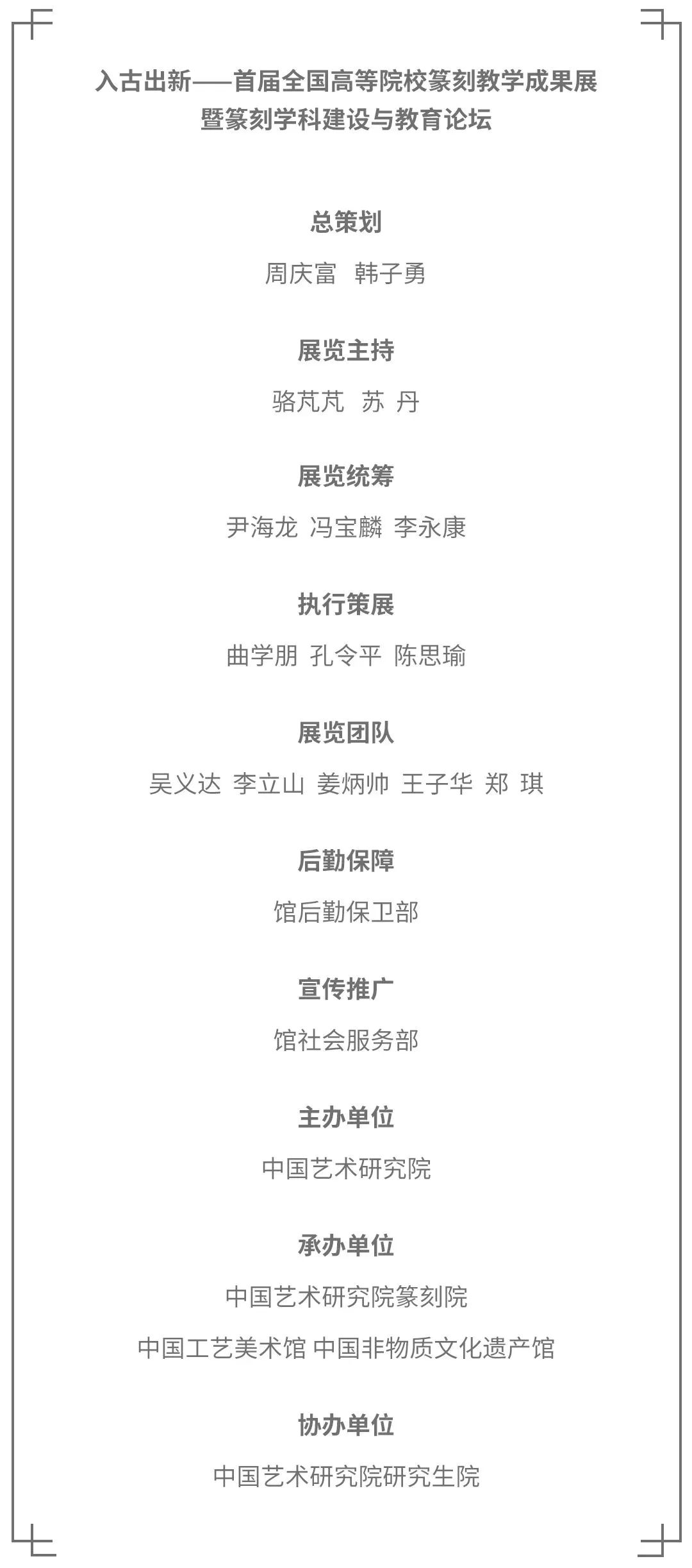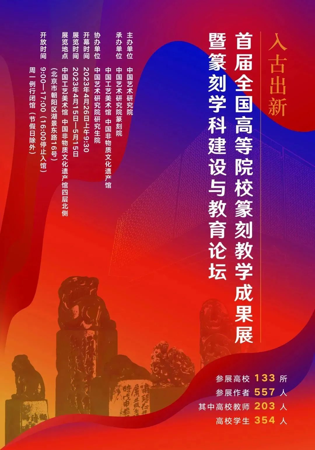 4月26日上午,由中国艺术研究院主办,中国艺术研究院篆刻院、中国工艺美术馆中国非物质文化遗产馆承办,中国艺术研究院研究生院协办的“入古出新”——首届全国高等院校篆刻教学成果展暨篆刻艺术学科建设座谈会,在中国工艺美术馆中国非物质文化遗产馆成功举办。 我院司长富老师参加由中国艺术研究院篆刻院主办的『入古出新』—— 首届全国高等院校篆刻教学成果展。作品在中国工艺美术馆 中国非物质文化遗产馆展出。 本次展览的举办,旨在展示当前篆刻艺术教育在高校中的优秀成果,同时挖掘和发现优秀教师和青年学子的学术研究能力和创作能力,使篆刻艺术的教学和篆刻艺术学科建设在高等院校中得以发展和完善。
