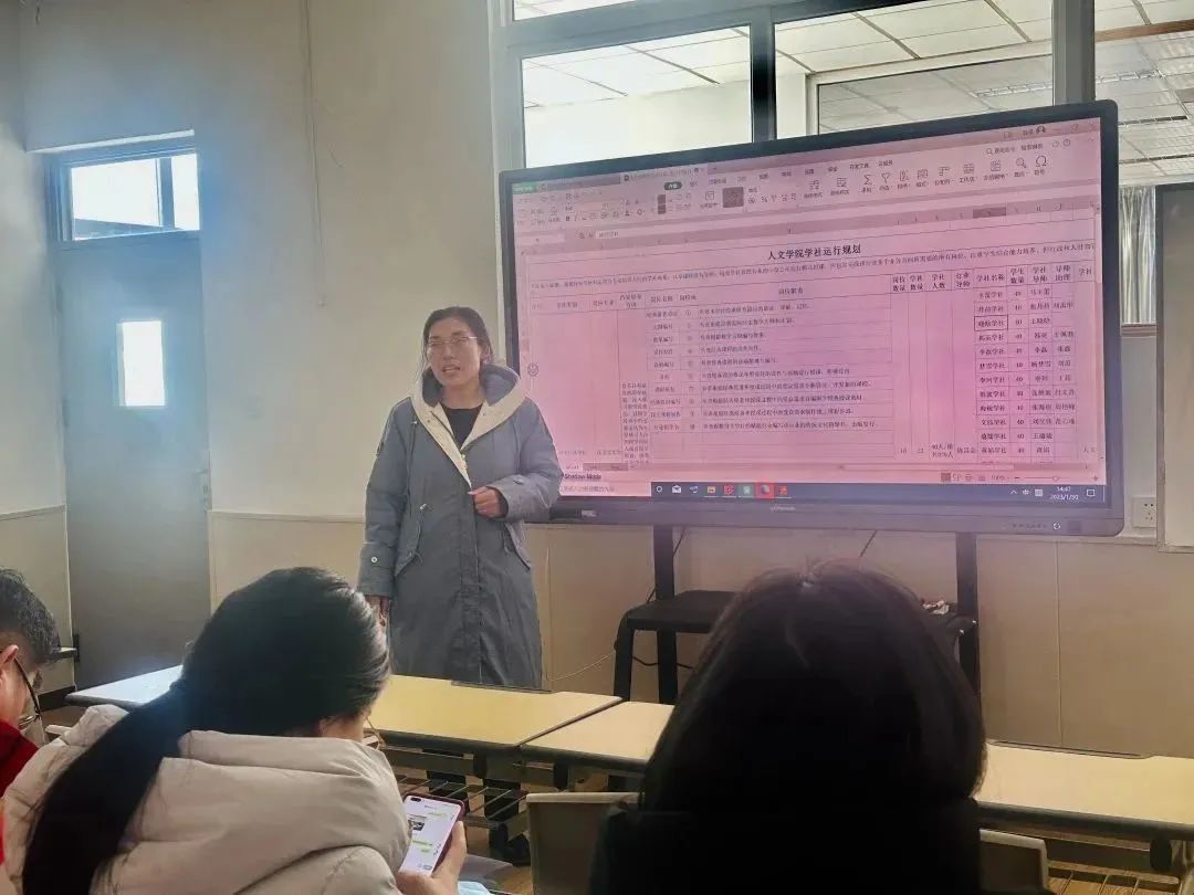 聚焦高质量发展 迈向新征程 人文学院召开期初全体教职工大会 新年伊始,万象更新。为使全体教职工在新的一年目标明确、有的放矢,以饱满的精神状态投入新学期的工作,人文学院于1月30日下午在A3-102A召开了2022-2023学年第二学期期初全体教职工大会。会议由孔祥丽院长主持,人文学院全体教职工参加会议。 正值新春佳节,孔祥丽院长首先代表领导班子和院务会向全体教职工拜年,祝贺大家新春吉祥。接下来,孔院长重点将学院新的一年的整体规划及工作的重中之重向大家进行了宣贯。新的一年,在学校的整体规划和部署下,人文学院的工作重点将放在两大方面:一是聚焦高质量发展;二是积极发展学社制。 新时代、新征程,为了实现到2035年将恒星学院建设成为“一流知名院校”的远景目标,所有恒星人文人都应该根据学校高质量发展指标,做好每一阶段每个岗位应做的工作。在2023年,人文学院的全体教职工,要目标明确,在学生管理、师资队伍、专业课程、科研及学生就业等各方面,撸起袖子加油干,争取年底更亮眼的KPI成绩。 学社制也是今年恒星学院的重点工作之一,同时也是实现恒星学院高质量发展远景目标的重要组成部分。人文学院自成立以来一直肩负传承和弘扬中华优秀传统文化的重任,在学社制建设中,也必将以传承经典为重点,为培养具有深厚文化底蕴,并能将优秀传统文化与时代需要紧密结合的优质新文科人才而不懈努力。 韩英院长随后就新学期尤其是近期人文学院主要的教学工作进行了初步安排。人文学院本学期在投入建设学社和卓越班的同时,仍将以全力迎战本科教学评估为主要任务。要求老师们务必在开学前完成恒星数课录制、上传任务,同时准备好教学五带,积极备课,保证高质量的课堂教学。 文教集团总裁、人文学院党总支书记刘振勇最后表达了对学院的期望,希望大家奋发图强,与学院和文教集团共同进步,奋进新征程。