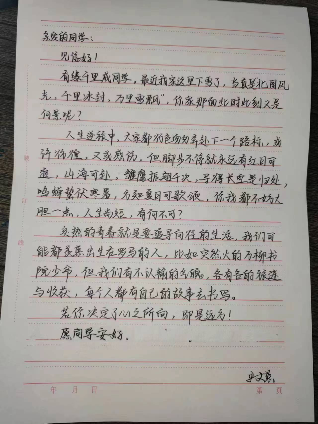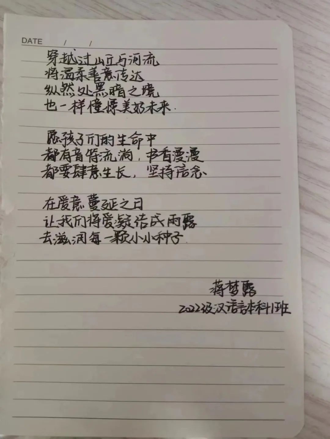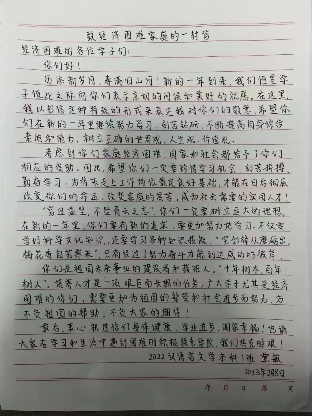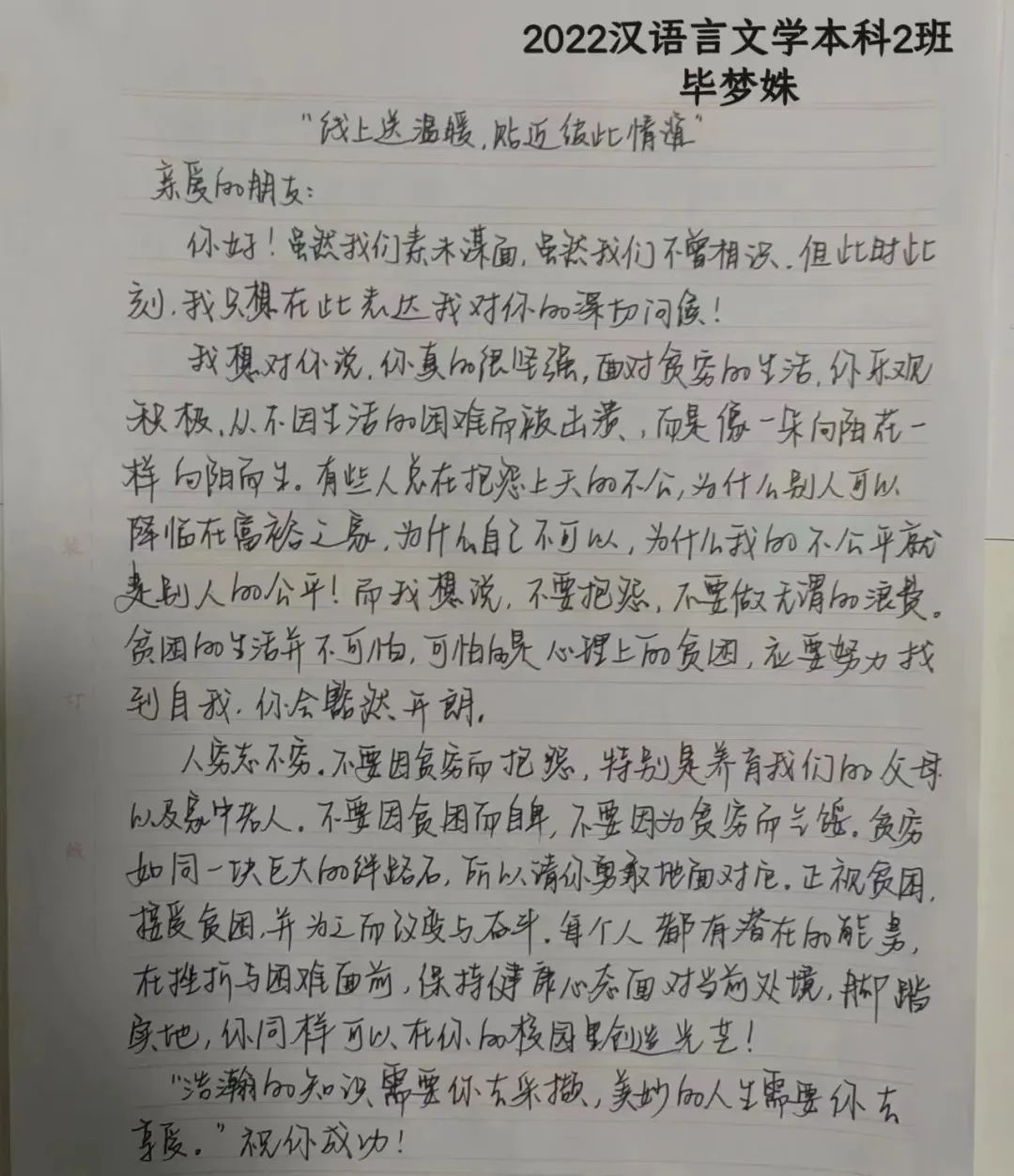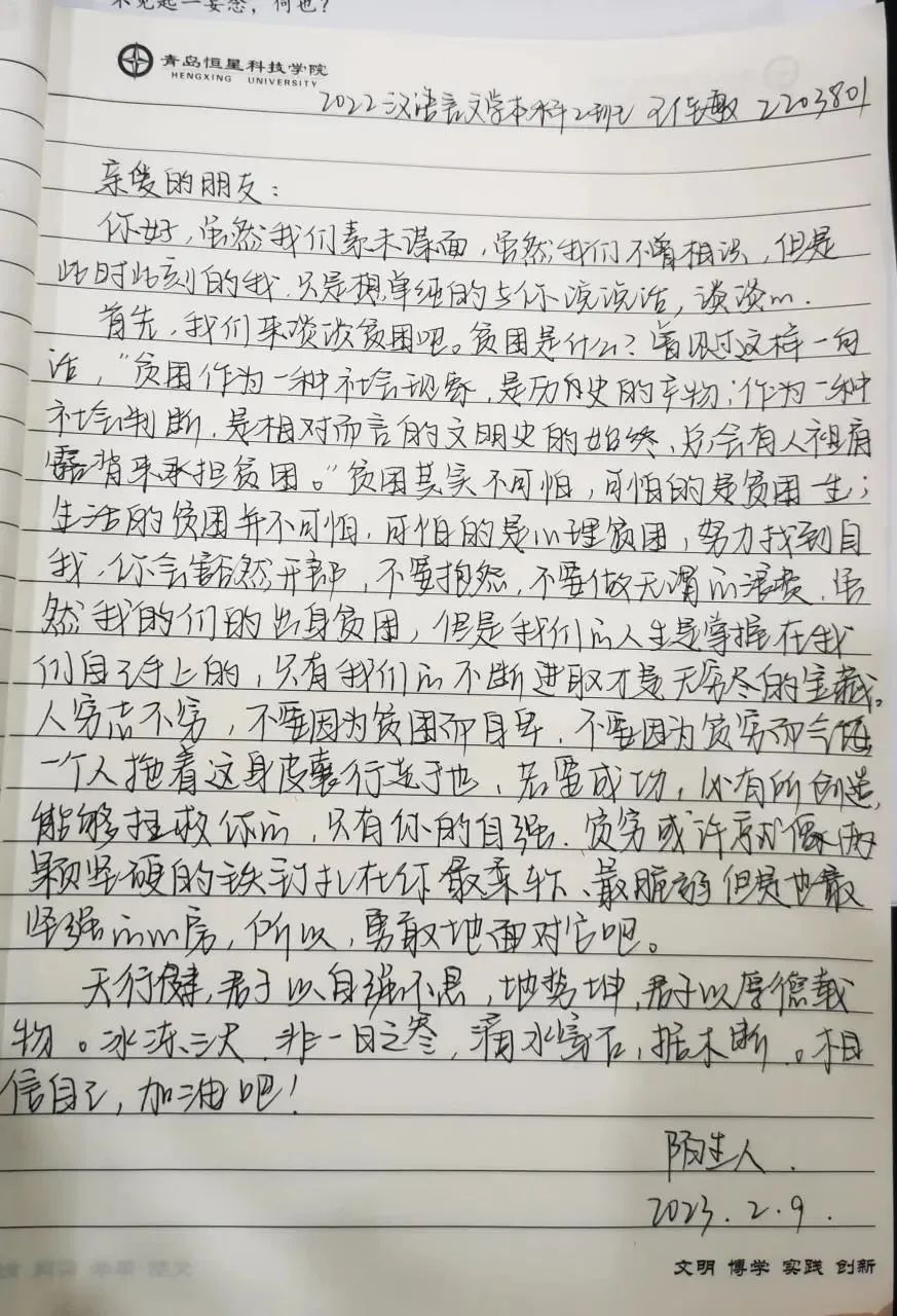 情系贫困生 关爱润心田 为深入学习贯彻党的二十大精神,切实帮助在校困难大学生解决学习、生活、就业等遇到的实际问题,人文学院团总支组织各团支部开展“我为同学送温暖”活动,为家庭经济困难的学生送去祝福,带去温暖与力量。 手写信总有一种遥远的温柔的力量,怀揣一腔情谊。奢侈的不仅是手写信,更是写信人对感情最真挚的表达,文字的力量是非比寻常的,信中的点点滴滴都在讲述着同学之间互相帮扶。几封手写信,让家庭经济困难的学生感受到来自同学之间的关怀温暖。 王佳敏22级汉语言本科2班 毕梦殊22汉语言本科2班 覃敏22汉语言本科1班 蒋梦露22级汉语言本科1班 史文慧22级汉语言本科4班 杜金宇22级社会工作本科1班 同学们的”照片”助力给家庭经济困难学生带来别样的温暖,希望家庭经济困难的学生能够身心健康、轻松愉悦地迎接来自生活的考验。希望他们收到这份“特殊照片”时,能领悟到同学们的用意,感受生活的美好。 一番话语的慰藉,一份同学的关爱,温暖着每一位学生,互相帮扶,传递的是爱心,营造的是希望。此次活动让贫困生们得到帮助,学会珍惜生活中的美好,学会关心他人,积极生活。我们将以实际行动把温暖继续传递下去,让希望的种子在我们心中生根、发芽,让充满爱心的花朵永远在我们心中绽放。