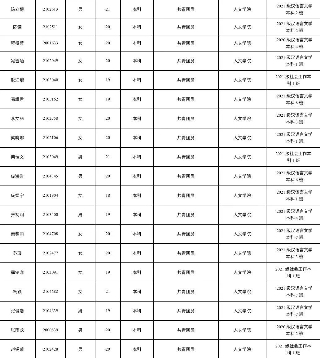 人文学院青马工程优秀学员名单公示 为深入学习贯彻习近平新时代中国特色社会主义思想和党的二十大精神,认真贯彻落实习近平总书记关于青年工作的重要思想,培养一批忠诚可靠的青年马克思主义者,为党输送优秀青年政治骨干,确保党的事业后继有人。经学院研究决定,将陈立博等十九名共青团员确定为第五期青年马克思主义者培养工程英才班的学员。 现将人文学院2022年度青马工程优秀学员名单公示如下: