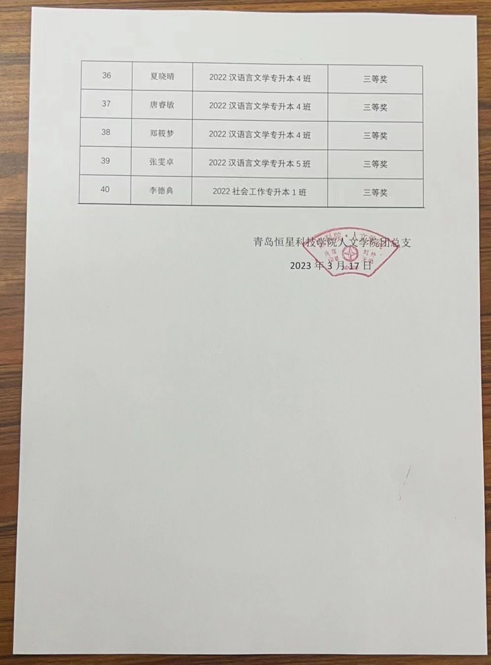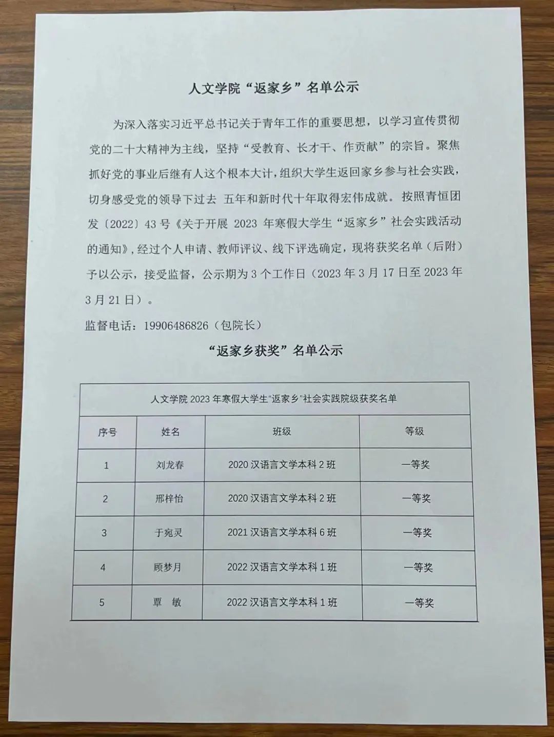 公 示 为深入贯彻习近平新时代中国特色社会主义思想,开拓实践育人方向,加强社会责任信念,让同学们在实践中得到巩固、发展、充实和提高,加强对自身所学专业的认识和应用能力。青岛恒星科技学院人文学院于2023年3月9-10日在A3-102A举办人文学院2023年寒假大学生“返家乡”社会实践评选活动。经过汇报同学激烈的角逐以及各位老师们的评分排名下,本次大学生寒假“返家乡”社会实践评选工作圆满结束,现对此次评选结果进行学院公示。