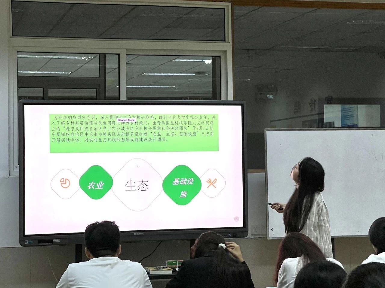 为深入学习宣传贯彻习近平新时代中国特色社会主义思想和党的二十大精神,贯彻落实习近平总书记关于青年工作的重要思想,同时为响应上级团组织号召,总结暑期三下乡社会实践成果,全面总结2023年大学生暑期“三下乡”社会实践活动经验,提升学生政治素质,展示学子风采,激励青年学生积极参与社会实践。青岛恒星科技学院人文学院9月17日于A3-102A举行2023年暑期“三下乡”社会实践成果总结评审会。 人文学院赴山东省临沂市沂水县夏蔚镇筑梦杨帆实践团,团队宣讲人详细介绍了自己团队的实践目的、实践过程和实践成果与意义。通过重温与实践的形式更好的了解和认识红色文化与革命精神,在学习和传承红色文化的同时促进自我提升,提高身体素质核能力,培养社会责任感和集体意识。 人文学院赴山东省济南市乡村振兴暑期社会实践团通过团队介绍、实施方案、内容报告、总结收获进行介绍,为大家介绍了济南南部山区等地农业的发展。 人文学院赴江苏省淮安市盱眙县黄花塘镇焦山村党史学习教育暑假社会实践团以“线上+线下”为模式,围绕党的发展历程进行研究,线下通过走进当地黄花塘新四军纪念馆进行了参观游览以及党史学习,探索党史文化发展,深刻研究红色精神。 人文学院赴宁夏回族自治区中卫市沙坡头区常乐镇罗泉村乡村振兴促进团暑期社会实践团队宣讲人从“农业、生态、基础设施”三方面的实地走访,讲述了团队对农村生态环境和基础设施建设的调研经历,并认识到扎根基层、助力农村、服务社会的重要性。 人文学院赴山东省枣庄市市中区党史学习教育暑期社会实践团队宣讲人从学习团队介绍、实地学习党史、实践心得总结三方面讲述了团队成员在枣庄市市中区垎塔埠街道依托新时代文明实践站学习党史的实践经历,带来了不一样的宣讲效果。 我们要立志做有理想、敢担当、能吃苦、肯奋斗的新时代好青年,让青春在全面建设社会主义现代化国家的火热实践中绽放绚丽之花。
