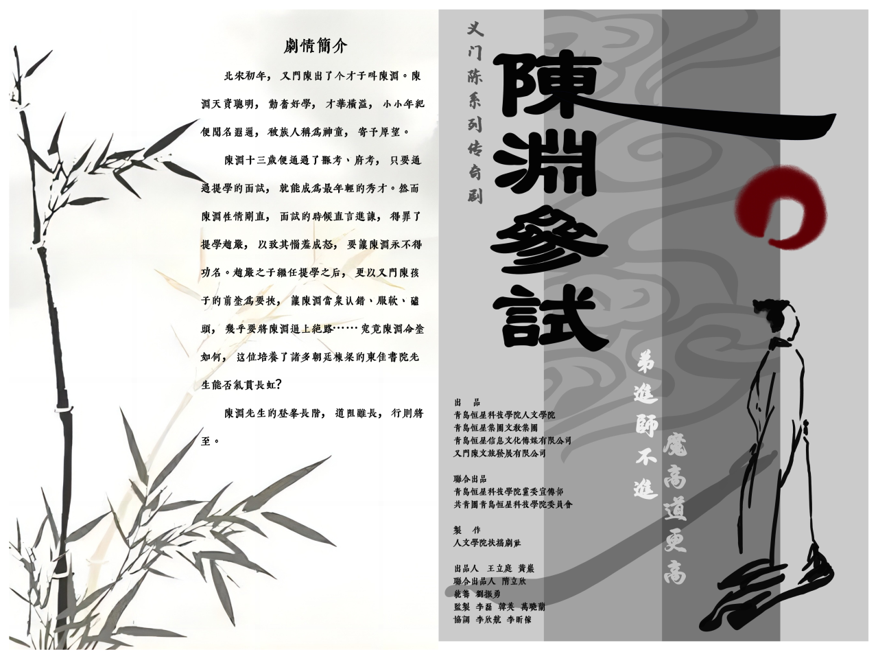 千磨万击还坚劲,任尔东西南北风。义门陈传奇人物陈渊的故事,即将上演。 4月10日下午3点和晚上7点,义门陈系列传奇剧《陈渊参试》即将在青岛恒星科技学院国际交流中心迎来首轮演出。本剧由青岛恒星科技学院人文学院与义门陈文旅发展有限公司出品,人文学院扶摇剧社制作演出,讲述了义门陈传奇人物,东佳书院教书先生曲折波澜而又正气凛然的一生,贯彻圣贤之道、为师之道的一生,为社稷、百姓仗义执言、刚直不阿的一生。在陈渊身上,我们不仅可以看到文人的风骨、君子的品格,也可以领略中华优秀传统文化的魅力与影响,更可以感受家风与家学的重要意义。 《陈渊参试》是义门陈系列传奇剧的开山之作,今后,人文学院与扶摇剧社还将推出更多系列传奇,展现义门陈深厚磅礴的历史与传承。同时,扶摇剧社还将制作演出更多符合中华优秀传统文化内容,展现人文内涵与人文关怀的舞台剧作品,恭请持续关注。 想要观看演出的老师和同学,现在可以报名抢票,抢票请联系:13186237469,名额不多,先到先得哟。