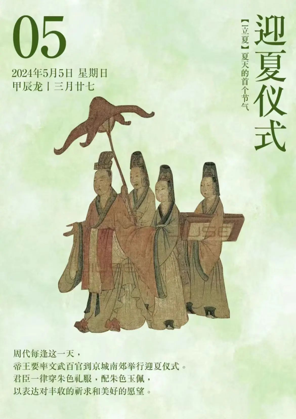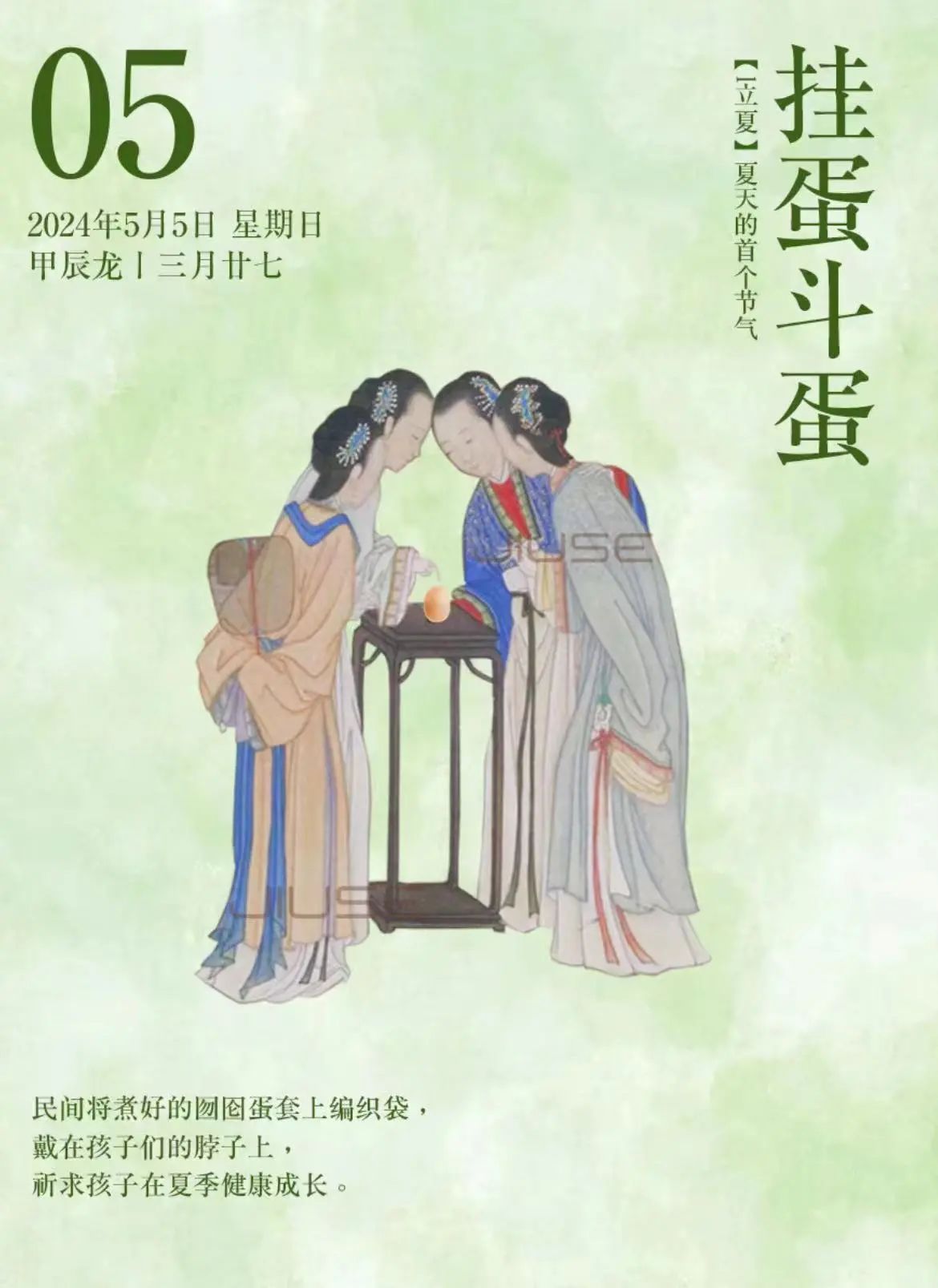 立夏表示告别春天 是夏天的开始 因此又称“春尽日” 春生、夏长、秋收、冬藏 何谓立夏 立夏是二十四节气中夏季的第一个节气,表示孟夏时节的正式开始,斗指东南,维为立夏,万物至此皆长大,故名立夏也。 立夏时节,气温升高,阳气上升,人体新陈代谢加快,心脑供血出现不足,常常使人烦躁不安,此时节应合理安排作息时间,调整饮食结构,保障营养。 SUMMER 立夏三候 一、候蝼蝈呜 蝼蝈,蝼蛄也,适宜温暖潮湿的环境中,随着蝼蛄的鸣叫,夏天的味道浓了。 二、候蚯蚓出 蚯蚓生活在潮湿阴暗的土壤中,当阳气极盛的时候,蚯蚓也不耐烦了,出来凌凌热闹。 三、候王瓜生 王瓜是华北特产的药用爬藤植物,在立夏时节快速攀爬生长,六七月会结红色的果实。 SUMMER 立夏习俗 立夏吃罢中饭还有秤人的习俗。人们在村口或台门里挂起一杆大木秤,秤钩悬一根凳子,大家轮流坐到凳子上面秤人。司秤人一面打秤花,一面讲着吉利话。 立夏秤人会对阿斗带来福气,人们也祈求上巷给他们带来好运。 二、迎夏 古代,帝王在立夏这天举行迎夏仪式,皇帝要将上年冬天储藏的冰赐给百官。 在民间,立夏日,人们则喝冷饮来消暑。江南水乡有烹食嫩蚕豆的习俗。 “立夏蛋,满街甩”,斗蛋通常是小孩子们的游戏。要用熟鸡蛋,一般是用白水带壳煮的囫囵蛋(蛋壳不能破损),经冷水浸过,然后装在用彩色丝线或绒线编成的网兜里让孩子挂在脖子上。SUMMER 立夏诗句 《立夏》 宋•陆游 赤帜插城扉,东君整驾归。 泥新巢燕闹,花尽蜜蜂稀。 槐柳阴初密,帘栊暑尚微。 日斜汤沐罢,熟练试单衣。 图文源自网络,侵删