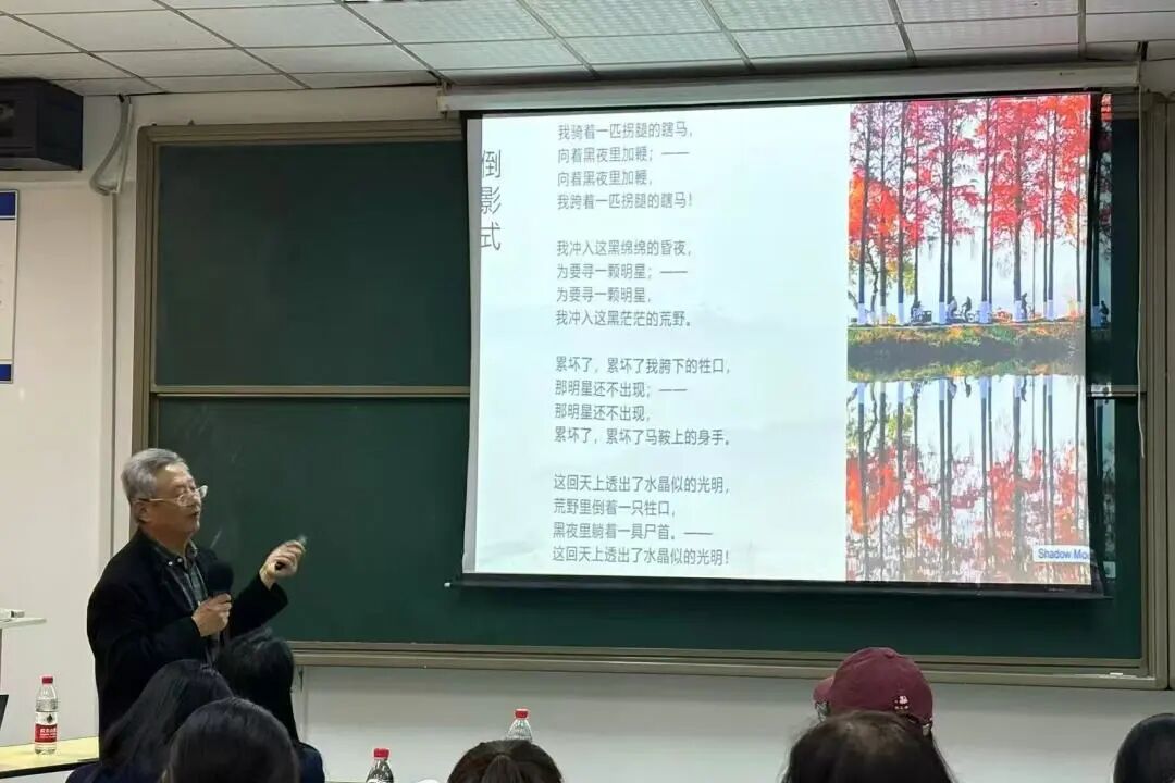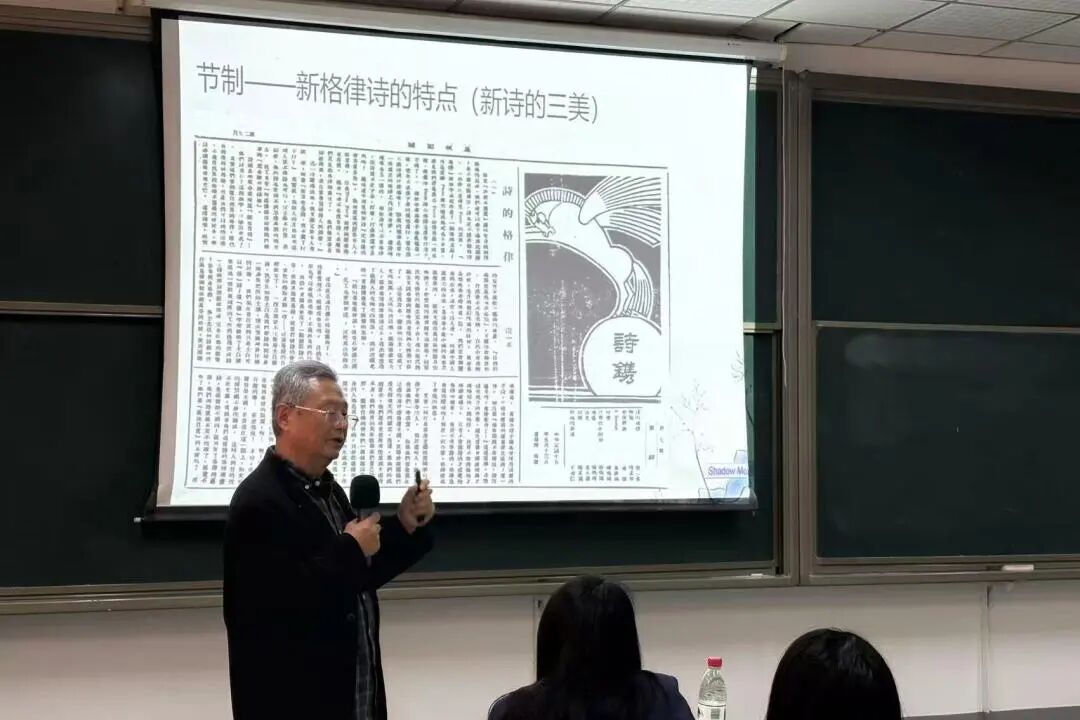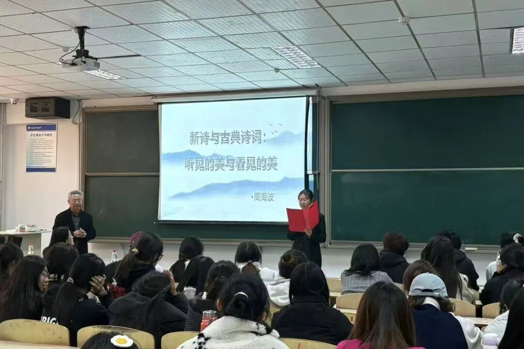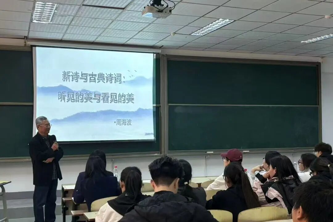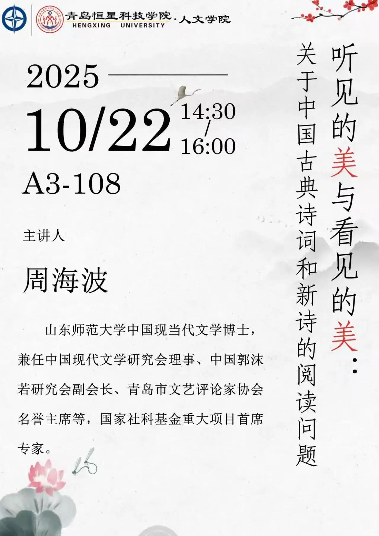 10月22日下午,青岛恒星科技学院中国语言文学类专业教学改革的核心成员——周海波教授应邀,在A3-108教室为人文学院学生带来了一场主题为“听见的美与看见的美”的学术讲座。 本次讲座聚焦听觉与视觉的美学维度,旨在带领同学们解锁感官背后的审美密码,深入探寻两种美感的独特性与交融性,为广大师生搭建一场兼具理论深度与体验感的美学交流平台。 何谓诗歌?突破格律,理解诗歌的完整肌理 周教授在讲台上解读古典诗词到现代新诗:狭义的“诗”常被囿于格律——《将进酒》的韵脚、《登高》的对仗,是声韵与形式的精准耦合;而广义的诗突破桎梏,现代新诗以《雨巷》的意象、《再别康桥》的分行重构表达,是从“听觉格律”到“视觉意境”的认知拓展。大学美育里,懂古典之“律”、明新诗之“变”,方能触摸到诗的完整肌理。 何谓诗歌之美?从听觉格律到视觉意境的感知拓展 针对“诗歌之美如何流转”这一核心问题,周教授从文学演进与审美感知两个维度深入阐释。古典“做诗”以吟唱传情,韵律节奏让美在听觉中流淌;现代“写诗”突破形式桎梏,郭沫若等以文字的视觉张力,让美在纸面绽放。他指出这种从“听见美”到“看见美”的跨越,既是诗歌艺术回应时代的革新,也是人类对美之感知从听觉向视觉拓展的内在驱动,彰显着文学与人性需求的深层联结。 诗歌审美之变 临近讲座尾声,周教授带我们回望诗歌审美之变:古典诗词以吟唱传递“听见的美”,韵律在听觉里流转;现代新诗则突破形式,以文字的视觉张力绽放“看见的美”。从听觉到视觉的跨越,既是诗歌艺术的时代应答,也是人类对美之感知的深层延展,为这场美学之旅画下意韵悠长的句点。 审美新旅程 从听觉韵律到视觉构图,从感官独立到跨界交融。这场讲座,不仅是一次美学知识的传递,更是一次感官认知的重塑,让同学们在思考与共鸣中,以全新视角发现生活中的美,开启更丰富的审美之旅。