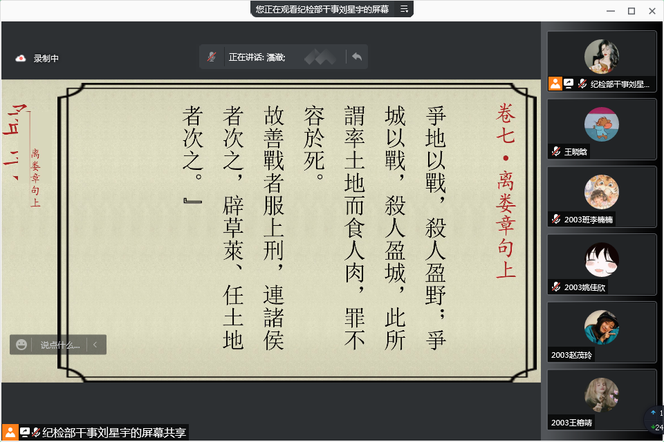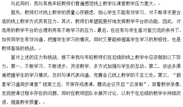 “凡益之道,与时偕行” ——疫情防控,线上教学 2022年的疫情“倒春寒”,打乱了有序的课堂教学,按照学校疫情防控工作的总体部署,人文学院全面开启线上教学。 目前,经过一周的线上教学,通过督导组的监督和反馈,人文学院在线教学工作进展顺利,线上教学整体工作正在有序推进。 ●为了进一步提升线上教学质量,老师们提交了“线上教学案例展示”,展示了线上教学的过程、心得、成果以及反思。 潘澈院长线上教学过程展示 韩英院长线上教学过程展示 王超老师的线上教学PPT展示 吴丹琦教授的线上教学心得 学生们线上课堂状态良好 学生笔记展示 王晓晗老师的线上教学反思 通过线上教学的摸索和实践,教师们一致认为拉近网络两端师生的心灵距离,这是新时代、特殊形势下,对教师们提出的新的命题。 面对这场没有硝烟的疫情之战,人文学院教师和学生们都展现出了莫大的勇气和伟大的奉献精神。巨大的压力不仅没有压垮我们,反而激荡出这个春天最美的希望之花,疫情终将散去,师生定会在校园内共同拥抱春天。