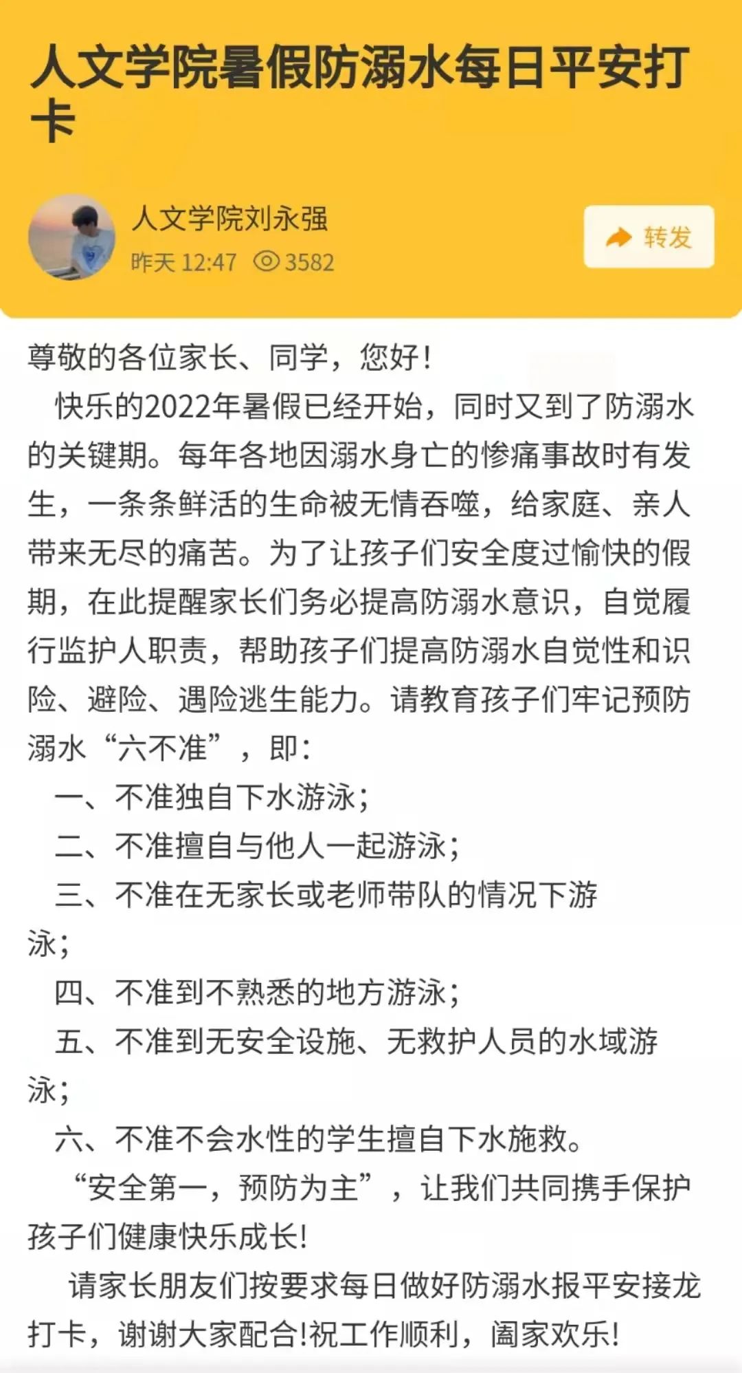 随着各地气温迅速上升 天气日渐炎热,汛期即将来临 学生溺水事故进入多发高发期 务必做好预防学生溺水事故有关工作 保障广大学生生命安全 1游泳防溺水注意事项 游泳,是广大青少年喜爱的体育锻炼项目之一,为了确保游泳安全,防止溺水事故的发生,必须做到以下几点: 1.不要独自一人外出游泳,更不要到不摸底和不知水情或比较危险且易发生溺水伤亡事故的地方去游泳。 2.要清楚自己的身体健康状况,平时四肢就容易抽筋者不宜参加游泳或不要到深水区游泳。 3.对自己的水性要有自知之明,下水后不能逞能,不要贸然跳水和潜泳,更不能互相打闹,以免喝水和溺水。 4.在游泳中如果突然觉得身体不舒服,如眩晕、恶心、心慌、气短等,要立即上岸休息或呼救。 2 溺水后如何自救 1.不要慌张,发现周围有人时立即呼救。 2.放松全身,让身体飘浮在水面上,将头部浮出水面,用脚踢水,防止体力丧失,等待救援。 3.身体下沉时,可将手掌向下压。 4.如果在水中突然抽筋,又无法靠岸时,立即求救。如周围无人,可深吸一口气潜入水中,伸直抽筋的那条腿,用手将脚趾向上扳,以解除抽筋。 发现有人溺水,一定不能冒然下水营救,预防应立即大声呼救,向大人求助。