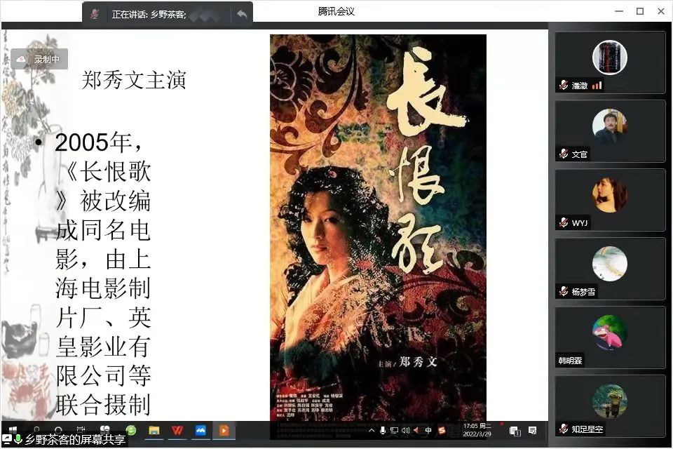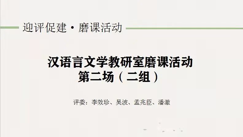 为打磨精品课程,全面迎接教学评估,按照计划,人文学院汉语言文学教研室分别于3月25日、28日和29日分批分组开展了五场教师磨课活动。为配合疫情防控工作,磨课活动以线上形式进行。 磨课通过腾讯会议在线上进行 为使磨课活动达到最佳效果,教研室进行了科学布局。3月25日首场磨课,年轻骨干教师打头阵。几位骨干教师有丰富的线下线上教学经验,课程展示逻辑思路清晰,内容充分考虑学生基础和特点,互动和练习设计也很科学,他们的磨课为其他专任教师提供了参照。 教研室主任李磊首场磨课讲授《韩非子·五蠹》 3月28日和29日的四场磨课,按照“以老带新”的培养原则,根据老师们的情况和上课安排,将参加磨课的老师们分成两大组,由骨干教师牵头,分批组织其他教师磨课,教授专家以示范教学并评价打分的形式参加。 第二场第二组磨课 此次磨课活动,内容涵盖了汉语言文学专业开设的全部专业课程,包括现代汉语、古代汉语、古代文学、现当代文学、国学经典、训诂学、写作学、史学、心理学等。老师们准备充分,讲课中精神饱满,技艺娴熟,体现了人文学院汉语言文学教研室教师团队较高的整体素质。教授专家们大家风范,倾囊相授,他们的示范课让年轻教师们看到了厚重的知识底蕴对教学的重要性,他们讲课旁征博引、信手拈来,又极具个人风格。他们的评价简洁、中肯,使年轻教师受益良多。 李效珍教授示范讲授王安忆的《长恨歌》 汉语言文学教研室磨课活动圆满结束。潘澈院长在最后的发言中提出本科教育应当具有一定的研究性,我们汉语言文学专业的教师们应该在这个方面多下功夫,要形成自己的讲授系统!“百舸争流,奋楫者先”,教研室同仁必将齐心协力,努力把每门课打磨成精品课程,以实力和信心迎接本科教学评估,迎接未来的教学工作。