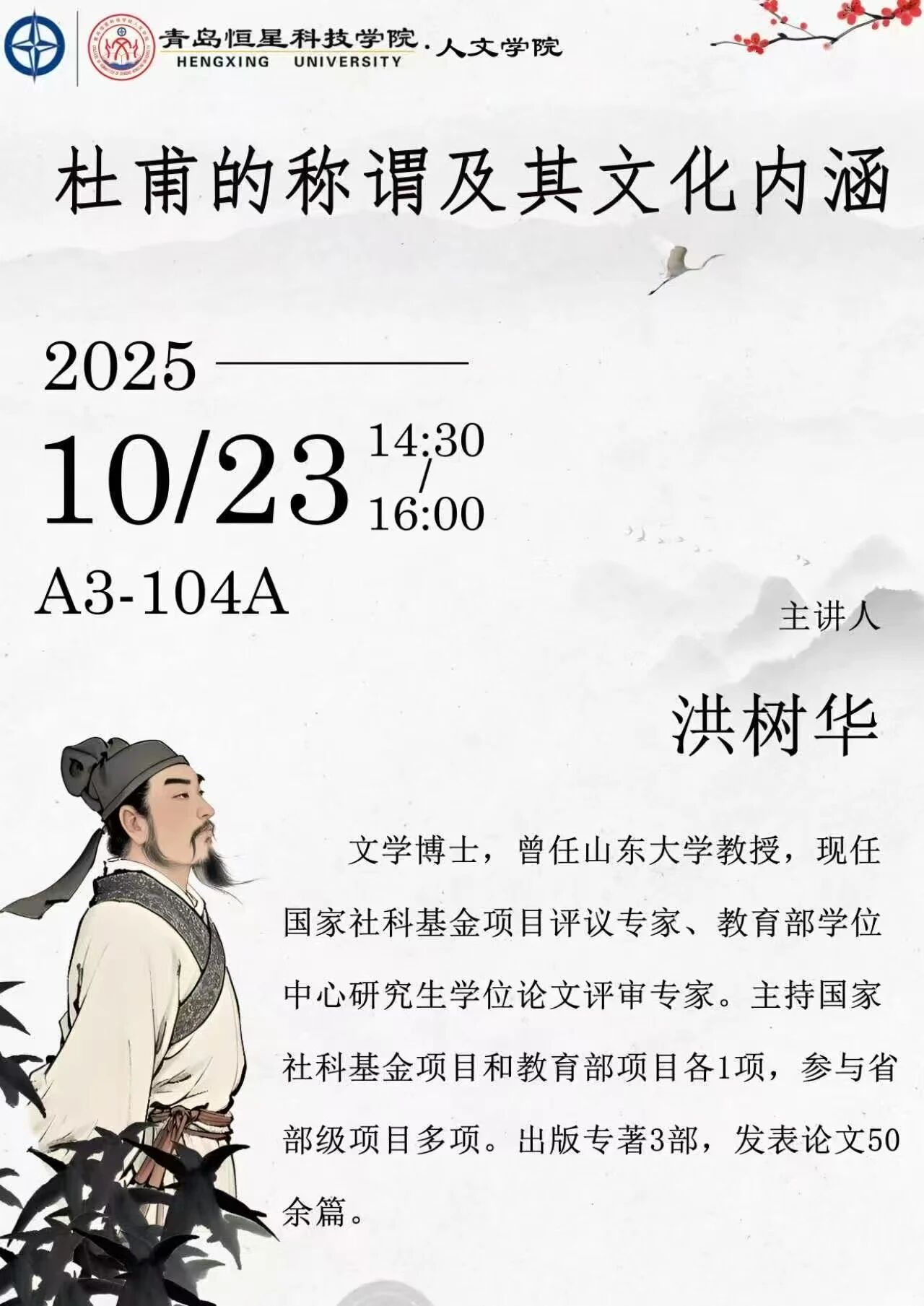 诗韵千年传颂,风骨一脉相承 为深化对中华优秀传统文化的理解,挖掘文学经典背后的文化价值,社会科学基金项目评议专家、教育部人文社科项目评审专家洪树华教授应邀,于2025年10月23日14:30-16:00在A3-104a举办“杜甫的称谓及其传统文化内涵”讲座,带你走进杜甫的称谓世界,解锁“诗圣”人生的多重维度。 02树立诗学新境,华章杜韵千秋 解码圣名妙理,传灯文骨长风 洪教授以深厚的学术积淀和生动的阐释,引导听众深入探究“杜甫称谓何来、有何文化深意、何以承载千年诗史内涵”,为喜爱唐诗、钻研古典文学的学者与爱好者打开了一扇深入理解杜甫及其时代文化精神的窗口。 讲座现场,洪教授以“杜工部”“杜拾遗”“少陵野老”等称谓为线索,结合具体诗作与历史事件,生动还原了杜甫从布衣到士大夫、从地方官员到流寓诗人的身份转变过程,使听众真切感受到称谓变迁中蕴含的诗人命运起伏与时代精神嬗变。 每一个称谓都是一扇窗口,透过它们,我们看到的不仅是杜甫个人的生命轨迹,更是唐代社会的文化氛围、宋明的历史文化,以及中华文化中独特的价值评判体系。从自称到他称,从生前到身后,这些称谓共同构建了杜甫在文学史和文化史上的多维形象。 不止于对称谓由来的梳理,讲座更将深入解读称谓背后的文化意义、时代背景,以及它们与杜甫个人形象、精神特质的关联。从“朱门酒肉臭,路有冻死骨”的悲悯,到“安得广厦千万间,大庇天下寒士俱欢颜”的担当,这些称谓如同打开杜甫精神世界的钥匙,让我们得以窥见一位伟大诗人如何在时代洪流中坚守初心,如何用笔墨书写人间疾苦与家国理想。 03诗意为笔,经典为舟 无论是热爱古典文学的同学,还是希望深入理解中华优秀传统文化的师生,这场讲座都为我们带来全新的思考。在这里,我们不仅能厘清杜甫称谓的演变脉络,更能透过这些称谓,读懂杜甫在文学史上的独特地位——他为何能成为“诗圣”?他的作品为何能跨越千年仍直击人心?他的精神又如何影响着一代又一代中国人? 通过深入剖析杜甫的各类称谓,我们不仅能触摸到古代文人的精神脉络,更能体会到中华文化中“文以载道”的深刻内涵。每一个称谓都是历史长河中的一颗明珠,它们串联起杜甫的一生,也折射出那个时代的风云变幻,引领我们走进一个充满诗意与哲思的文化世界。 这场讲座以杜甫为镜,映照出中华优秀传统文化的深厚底蕴与时代价值,激励我们在传承中创新,在回望中前行,让千年诗心继续在新时代熠熠生辉。