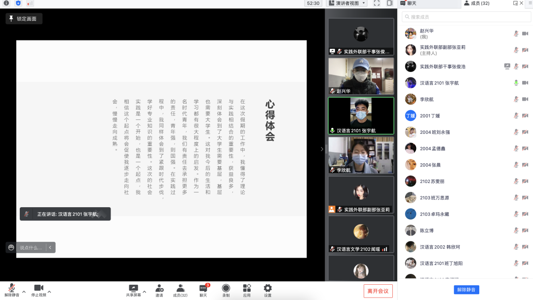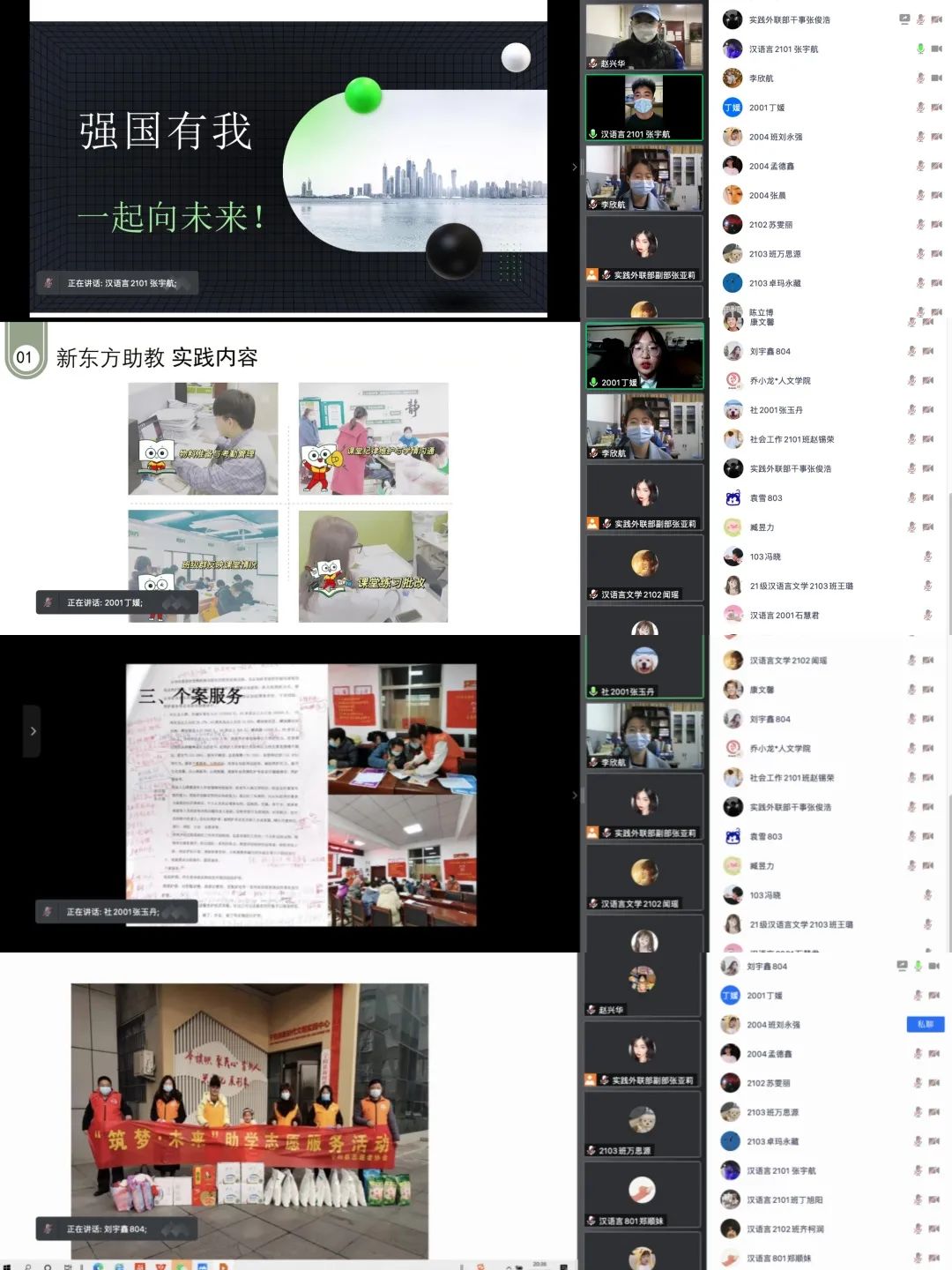 为坚持“受教育,长才干,做贡献”的宗旨,通过“返家乡”社会实践活动,引导大学生充分感受家乡的变化,回报家乡的责任感、使命感。人文学院于2022年3月7日举办大学生寒假“返家乡”社会实践评选活动。 因疫情影响,本次社会实践报告评选活动采取了线上评选的方式,参与本次评选的评委老师们分别是:学生处张晗旭老师,人文学院乔小龙老师、臧昱力老师、李欣航老师、赵兴华老师。 参选同学们的报告主题新颖且积极向上,内容多样且富有真情实感。其中包括在企事业单位实践、社区志愿服务、政府部门实习、云支教等。体现了青年大学生积极向上的良好风貌。 在企事业单位实践的同学们了解了工作模式,提前走进社会、感悟社会;在社区做志愿服务的同学们为抗击疫情、关爱社区弱势群体等方面贡献了自己的一份力量;在政府部门实习的同学们学习处理日常的行政事务,提升了个人能力和水平;参与云支教的同学们通过线上互动、日常监督等形式,在帮助小朋友们茁壮成长的过程中,同学们的专业知识得到了运用,提高了自身综合素质。 不忘初心跟党走,牢记使命勇担当。社会实践不仅有利于大学生提前了解社会、了解国情,增强了社会责任感,提高了大学生适应社会、服务社会的能力。通过本次社会实践活动希望大家可以及时总结经验,将自己的专业知识运用到实践当中,为家乡建设贡献出自己的力量。