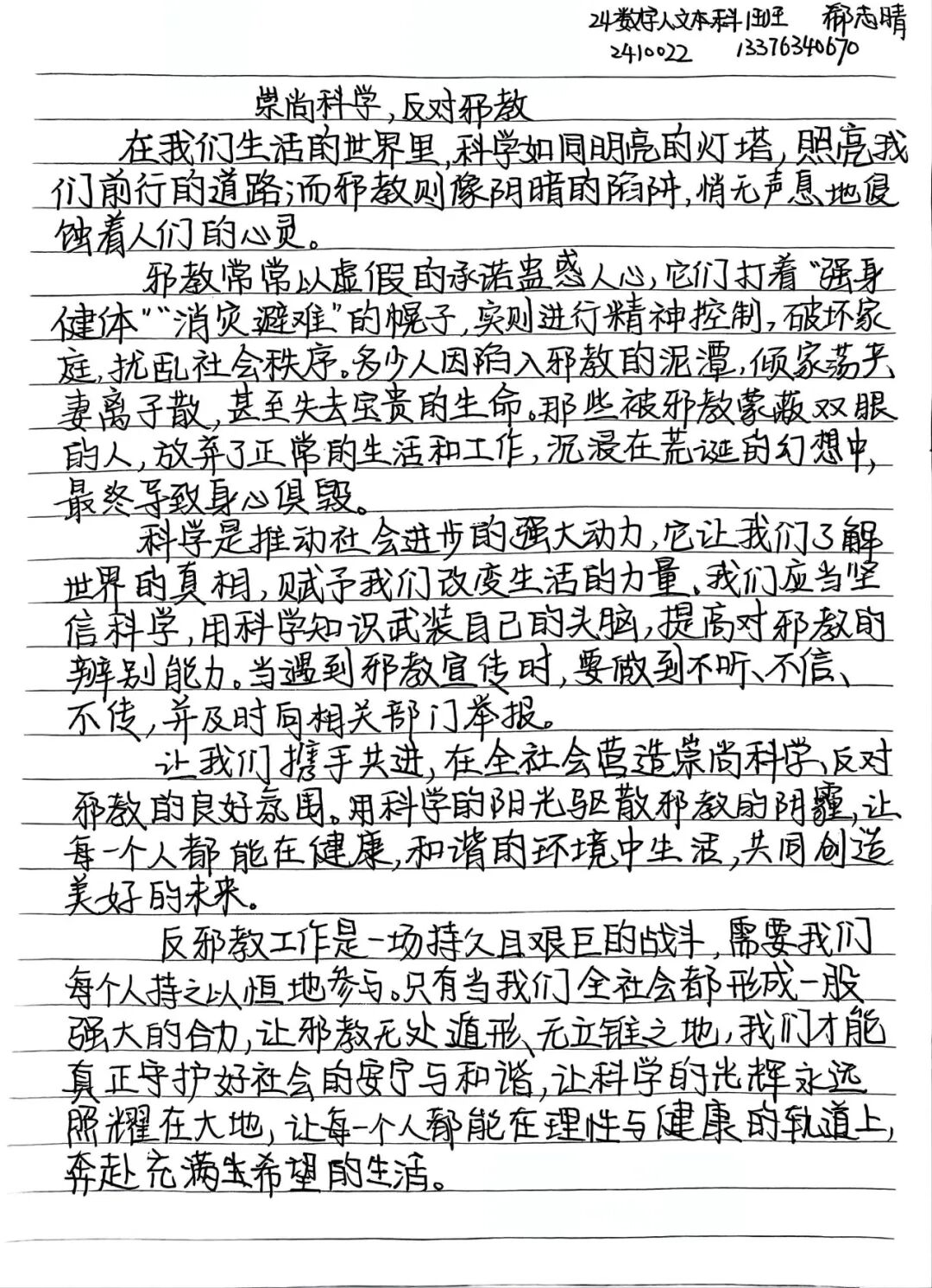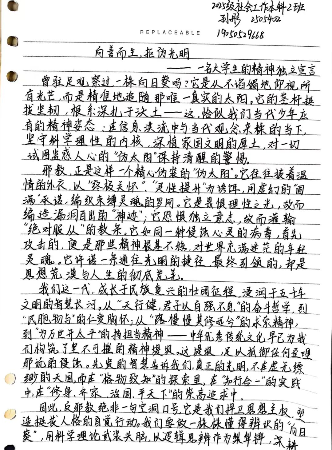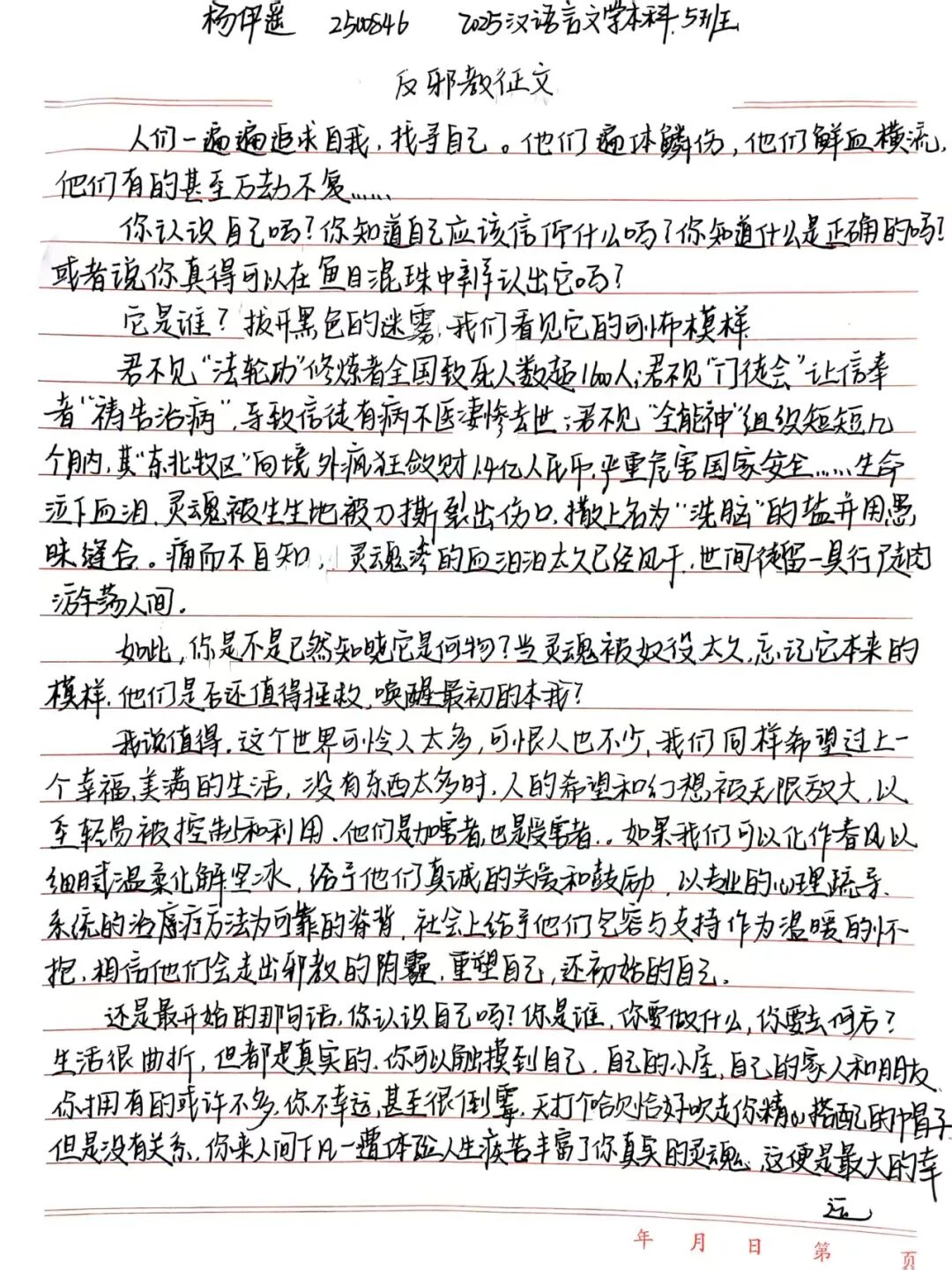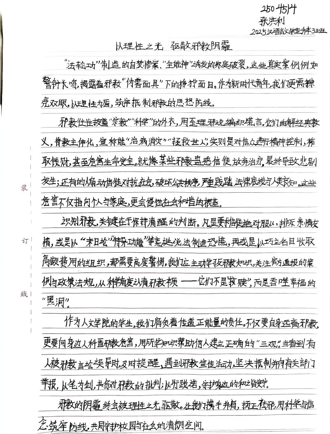 为深入学习宣传贯彻党的二十大精神,持续推动反邪教集中宣传工作常态化、长效化、品牌化,切实提高同学们识邪防邪拒邪能力,人文学院紧扣“扬正祛邪 共建和谐”活动主题,发起此次反邪教征文活动。 旨在以文字为刃撕破邪教丑恶本质,以笔墨为媒深化警示教育,筑牢抵御邪教的精神防线。活动得到同学们积极响应,每一篇都是对邪教的有力驳斥。 左右滑动查看更多 这些优秀征文,字字铿锵有力,句句饱含赤诚。同学们以笔为刃,直击邪教虚伪本质;以文为声,唤醒大众清醒认知。每篇作品都是对邪祟的严正驳斥,更是对正义的坚定守护,让反邪信念在文字中传递,凝聚起抵御邪教的强大力量。 字筑防线,青春反邪 同学们用敏锐的视角洞察邪教危害,以生动的文字拆解邪教伪装,或结合案例警示风险,或用科学知识传递理性,将对社会正义的追求、对平安家园的守护融入字里行间,让反邪教宣传既有思想深度,又充满青春活力。 若发现邪教活动踪迹,或身边人误入歧途,别犹豫、别沉默,及时向公安机关或社区举报,用法律利剑斩断邪教魔爪。让我们并肩筑牢防线,让邪教无处遁形,守护每一个家庭的安稳与人间烟火。