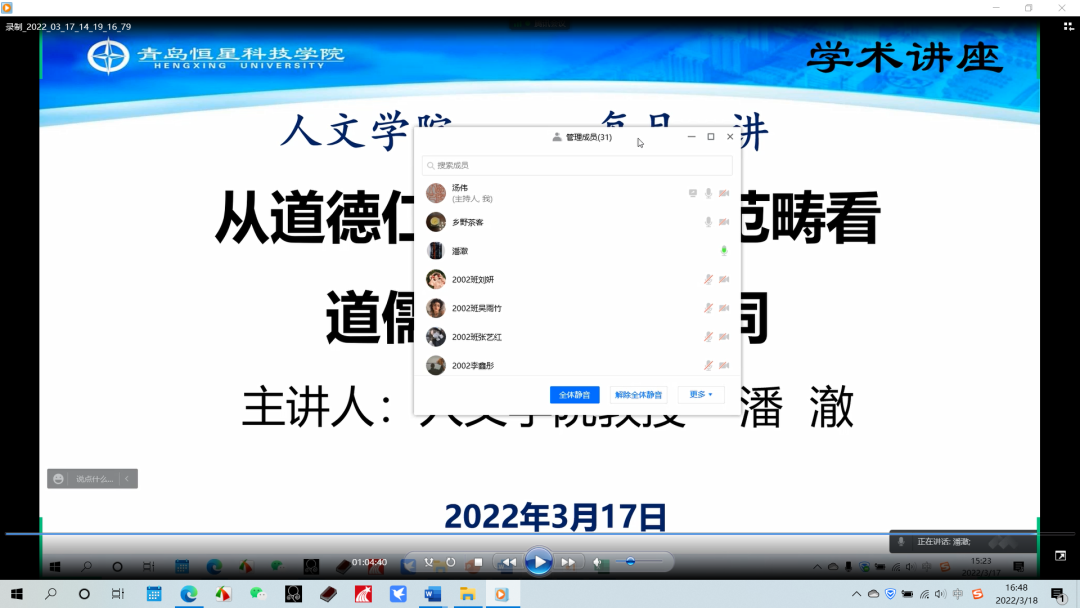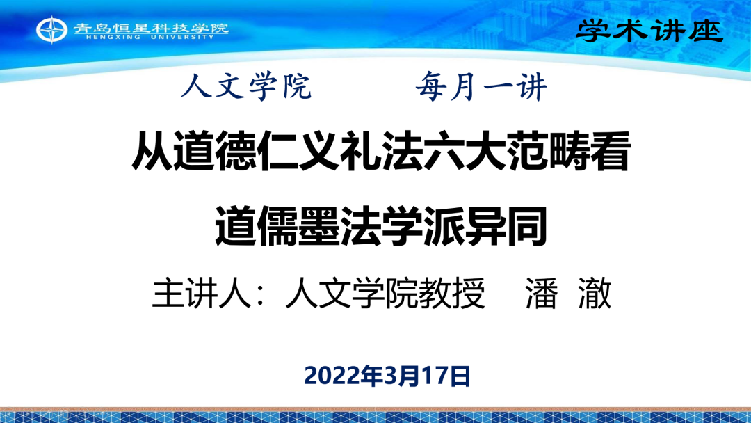 为持续营造浓厚的学术氛围,3月17日下午人文学院举办线上“每月一讲”学术活动。潘澈教授为人文学院师生做了题为“从道德仁义礼法六大范畴看道儒墨法学派异同”的学术讲座。 讲座中,潘教授从道、德、仁、义、礼、法六大哲学范畴深入比较先秦诸子中最有影响的道、儒、墨、法四家的异同。指出其相同之处在于四个学派的思想都包含这六大哲学范畴,而其区别是四个学派各自都有自己的核心范畴:道家以“道”“德”为核心,儒家以“仁”为核心。潘教授以古为鉴,阐述了对道、儒、墨、法学派哲学范畴当代价值的认识。讲座的最后,潘澈教授与学院师生进行了探讨交流。 本次讲座是人文学院2022年春学期的首场学术讲座,由此拉开了本学期“每月一讲”学术活动的序幕。
