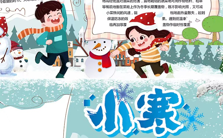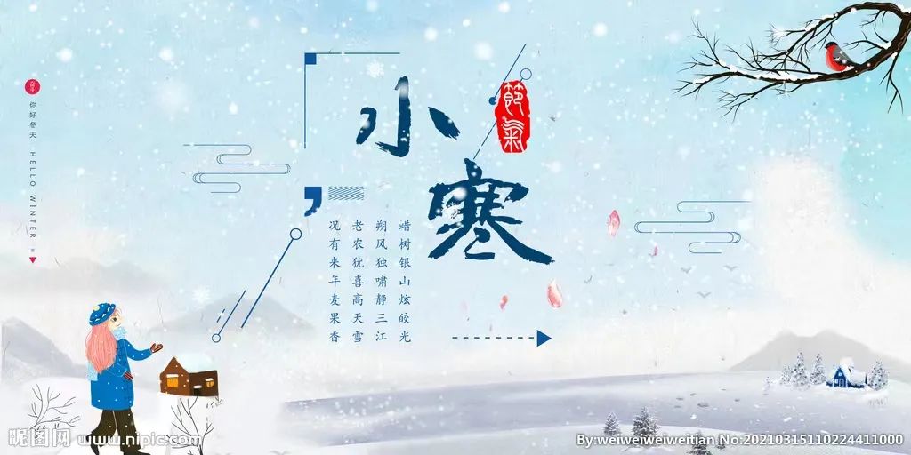 小寒 1月5日 月初寒尚小,月半则大矣 十二月节,月初寒尚小 故云,月半则大矣 一候雁北乡,二候鹊始巢,三候雉始鸲。 小寒节 十五天 小寒是表示气温变化的节气,《月令七十二候集解》载:“十二月节,月初寒尚小,故云,月半则大矣。”这个节气过后,气温渐渐变得寒冷,又由于小寒还处于“二九”的最后几天里,小寒过几天后,才进入“三九”,并且冬季的小寒正好与夏季的小暑相对应,所以称为小寒。 WINTER 小寒连大吕 欢鹊垒新巢 数九,又称冬九九,是古代民间一种计算寒天的方法。数九计算寒天这一方法在我国民间口口相传,有历史,乏记载,至于起源何时,没有确切的资料。 数九歌:“一九二九不出手,三九四九冰上走,五九六九沿河看柳,七九河开,八九燕来,九九加一九,犁牛遍地走。” WINTER 小寒胜大寒 常见不稀罕 养生 中国医学认为,寒为冬季的主气,小寒又是一年中最冷的季节。 所以,虽然小寒养生包括的内容很多,但基本的原则仍是《黄帝内经》中的那一句格言:“春夏养阳,秋冬养阴。”所以冬日养生很重要的一点就是“养肾防寒”。 WINTER 大寒小寒 冻成一团 《咏廿四气诗·小寒十二月节》 元稹 小寒连大吕,欢鹊垒新巢。 拾食寻河曲,衔紫绕树梢。 霜鹰近北首,雊雉隐丛茅。 莫怪严凝切,春冬正月交。 《窗前木芙蓉》 范成大 辛苦孤花破小寒, 花心应似客心酸。 更凭青女留连得, 未作愁红怨绿看。 图文源自网络侵删
