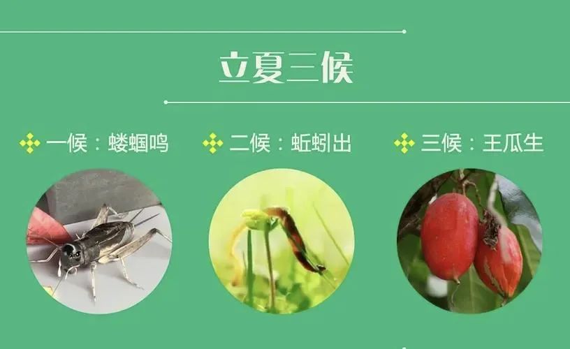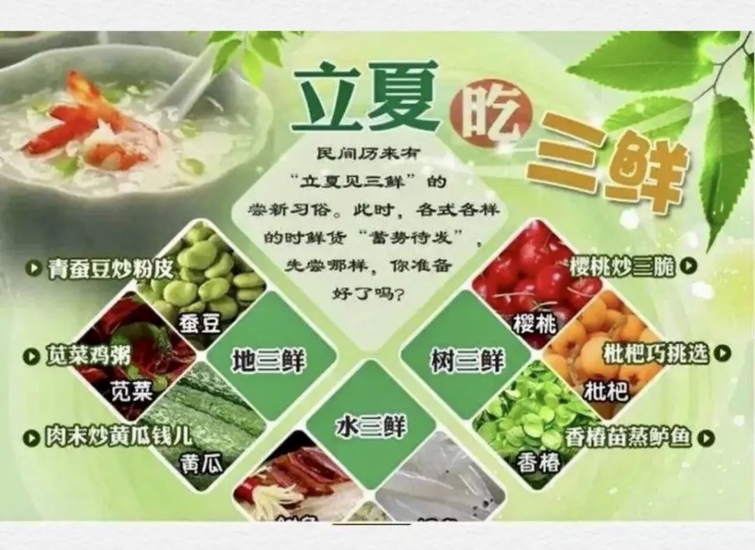立夏节气 春争日 夏争时 01 立夏简介 SUMMER 立夏,是二十四节气中的第7个节气,夏季的第一个节气,交节时间在每年公历5月05-07日。此时北斗七星的斗柄指向东南方,太阳黄经达45°。历书:“斗指东南,维为立夏,万物至此皆长大,故名立夏也。”立夏后,日照增加,逐渐升温,雷雨增多。立夏是标示万物进入旺季生长的一个重要节气。时至立夏,万物繁茂。 02 立夏三候 SUMMER 《逸周书·时讯解》有:“立夏之日,蝼蝈鸣。又五日,蚯蚓出。又五日,王瓜生。”这里显示了夏至有三侯,为一候蝼蝈鸣,二候蚯蚓出,三侯王瓜生。意思是在这时节,首先有蝼蝈鸣叫着夏季的来临,接着大地上便会有蚯蚓帮助农民们翻泥掘土,然后乡间的瓜果蔬菜也争相出土攀长。 03 立夏习俗 SUMMER 1.迎夏仪式 “立夏”的“夏”是“大”的意思,是指春天播种的植物已经直立长大了。廿四节气反映了四时“气”的变化,气的变化关系到自然节律变化,立夏阳气渐长,万物随阳气上升而茁壮成长。古代,人们非常重视立夏的礼俗。在立夏的这天,古代人们有举行迎夏仪式。 2.尝新活动 江南的立夏习俗里有所谓的“见三新”,就是吃些这个时节长出来的鲜嫩物儿。在江浙一带有“立夏尝新”的风俗。苏州地方有“立夏见三新”的谚语。“三新”指新熟的樱桃、青梅和麦子。人们先以这“三新”祭祖,然后人们尝食。同时,苏州立夏还要吃海蛳、面筋、白笋、荠菜、咸鸭蛋、青蚕豆,各家酒店立夏这天对进店的老顾客奉送酒酿、烧酒,不取分文,因此也把立夏叫做“馈节”。无锡民间历来有“立夏尝三鲜”的习俗。在常熟,人们立夏尝新,食品更为丰富,有“九荤十八素”的说法。浙江、江苏、湖北、湖南、江西、安徽等地,人们仍然保留着立夏吃乌米饭的古老习俗,乌米饭是一种紫黑色的糯米饭,是采集野生植物乌桕树的叶子煮汤,用此汤将糯米浸泡半天,然后捞出放入木甑里蒸熟而成。 3.立夏秤人 立夏吃罢中饭还有秤人的习俗。人们在村口或台门里挂起一杆大木秤,秤钩悬一根凳子,大家轮流坐到凳子上面秤人。司秤人一面打秤花,一面讲着吉利话。立夏秤人会对阿斗带来福气,人们也祈求上苍给他们带来好运。 04 饮食习惯 SUMMER 1.盐城称重 盐城境内居民对立夏节颇为重视,这天的饮食有熟煮蛋、熟莲藕、裹粽子、蒸粘饼等等。此外,还有一项特殊的习俗:吃黄烧饼。 2.福州吃鼎边糊 立夏季节,福州风俗流行煮鼎边“做夏”。鼎边糊(又称锅边糊),用米浆涮锅边烧煮而成,配以虾米、虾油、葱菜、金针、黑木耳、蚬子,或少量香菇、蛏干等海鲜清汤。 3.江南吃三新 江南地区有立夏尝“三新”的俗谚。“三新”即樱桃、青梅、鲥鱼。“三新”也有指“竹笋、樱桃、梅子”,“樱桃、青梅、麦仁”,“竹笋、樱桃、蚕豆”的。总之,在立夏时节,可吃上时令新鲜的食物。 4.立夏吃蛋 古人认为,鸡蛋圆圆溜溜,象征生活之圆满,立夏日吃鸡蛋能祈祷夏日之平安,经受“疰夏”的考验。立夏日一般在农历的四月,“四月鸡蛋贱如菜”,人们把鸡蛋放入吃剩的“七家茶”中煮烧就成了“茶叶蛋”。“立夏吃只蛋,力气大一万”,宁波人有立夏吃茶叶蛋的习俗。 5.立夏茶 为迎接立夏,我国江西一带还有立夏饮茶的习俗,说是不饮立夏茶,会一夏苦难熬,在立夏的那一天,妇女们要聚集七家的茶叶,共同烹饮,说是立夏饮了七家茶,可以保证整个夏天不会犯困。